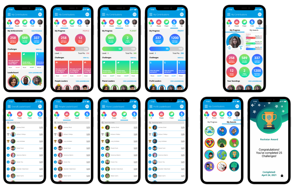 Additional screens to improve the My Contributions module to show new icons, a cleaner interface, and a better gamified experience with changes to the Leaderboard rankings that are emphasized with crowns and trophies.