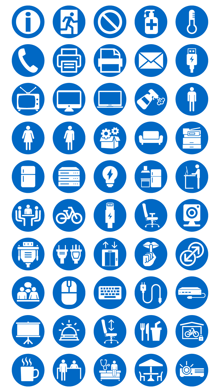 A small set of vector-based amenity icons created for use in the app. Each amenity represents a feature or function available in an office space to provide additional visual booking information.